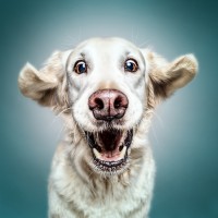 The image features a golden retriever, a breed of dog. It appears to be a studio shot with the dog against a plain background, possibly for the purpose of capturing a high-quality portrait or for use in marketing materials. The dog is looking directly at the camera and has its ears flapping outwards as if it's excited or happy.