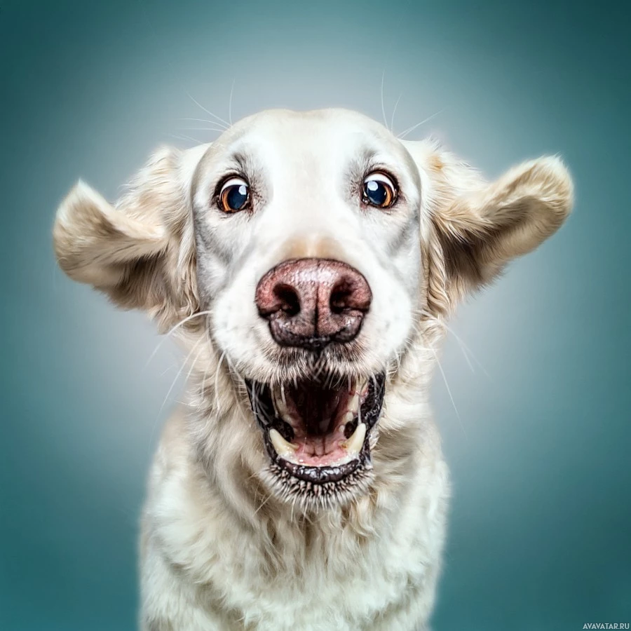 На картинке изображен золотой ретривер, порода собак. Похоже, что это студийный снимок с собакой на простом фоне, возможно, с целью съемки качественного портрета или для использования в маркетинговых материалах. Собака смотрит прямо в камеру и ее уши хлопают наружу, как будто она взволнована или счастлива.