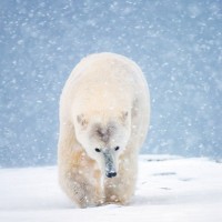 a polar bear on what appears to be an icy or snowy surface. The bear is standing with its