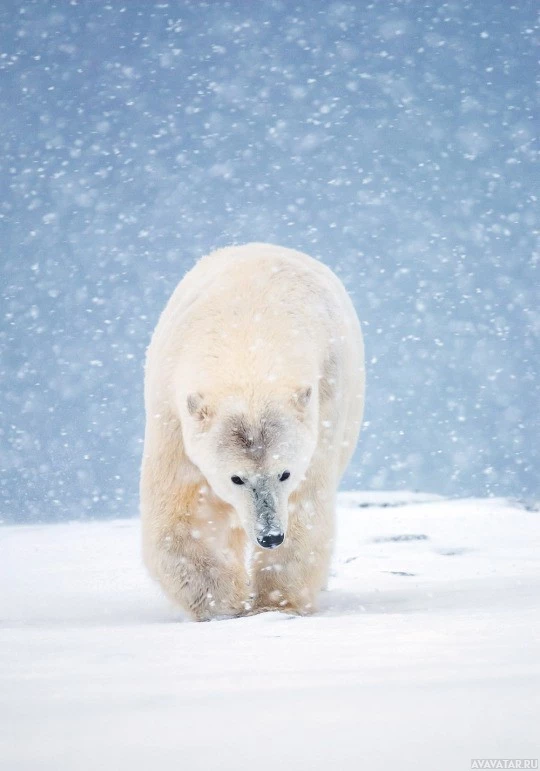 front legs partially submerged in the snow, and it's looking downward at something on the ground. The weather seems to be cold and windy, as indicated by