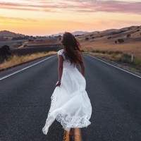 a white dress that appears to have lace details around the hem and sleeves. Her figure is silhouetted against the backdrop of a sunset or sunrise with the sky transitioning from