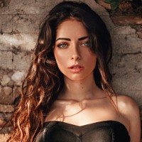 a brick wall with a neutral background. She appears to be looking directly at the camera with