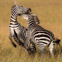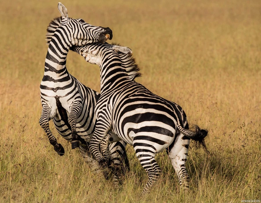Картинка показывает две зебры в поле. Они, кажется, участвуют в том, что можно считать игривым поведением, поскольку одна зебра имеет передние ноги вверх и обращена к другой с опущенной головой. Фон предполагает травянистую равнину или среду обитания саванны, типичную для того места, где встречаются зебры.