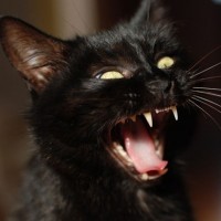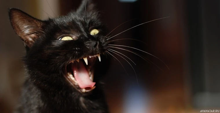 a black cat with its mouth open, giving an appearance of yawning or perhaps reacting to something. Its eyes are wide open and the fur looks slightly disheveled, which might indicate that the cat is in motion or has been startled. The background is blurred but it appears to be indoors.