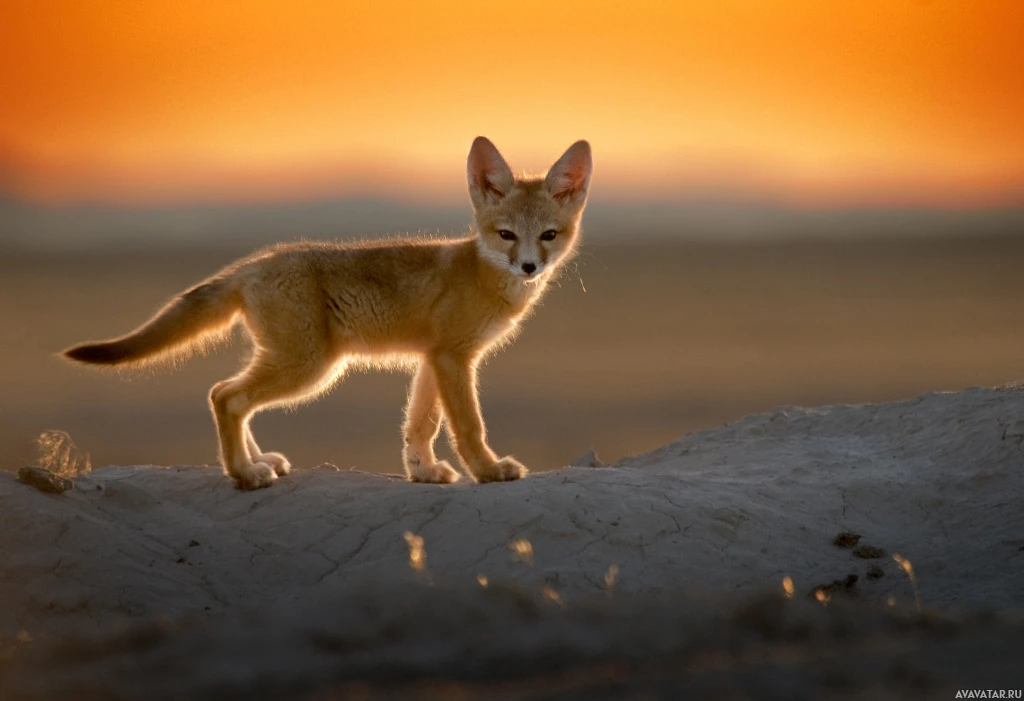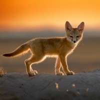 a young fox on an open sandy area, likely a beach or desert environment. It is during what appears to be either dawn or dusk, as indicated by the soft, warm lighting that suggests