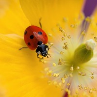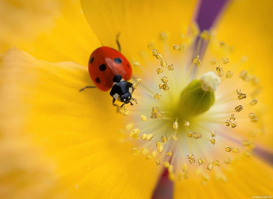 The image features a close-up of a ladybug perched on the edge of