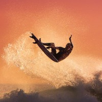 The image depicts a silhouette of a man surfing on a wave during sunset. The sky is colored with hues of orange and pink, which are typical colors associated with the end of the day. There are no other distinct features or objects visible in the picture due to the focus on the surfer and the wave's dynamic motion.