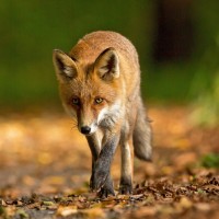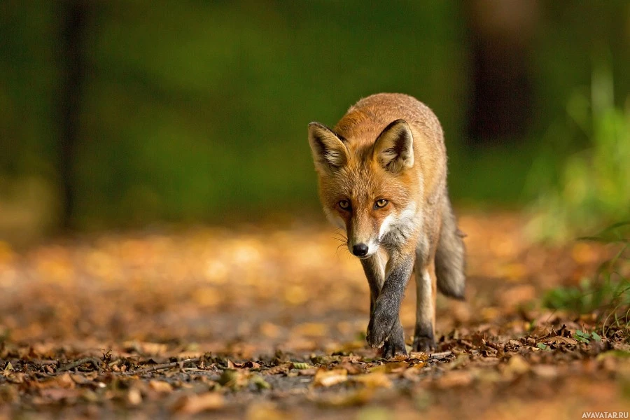 a red fox walking on what appears to be a forest floor with fallen leaves. The fox is in the center of the image and seems to be moving away from the viewer, looking back over its shoulder as if it has just caught or found something that caught its attention. The setting looks serene and natural, indicative of