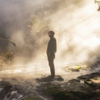 a silhouette of a person standing by the edge of what appears to be a waterfall or cascade. The individual is facing away from the viewer, looking towards the misty water and the surrounding