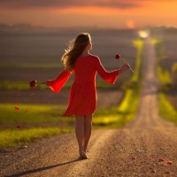 long hair and is wearing a dress that stands out against the natural background, suggesting it might be red. The road is lined with trees, and there's