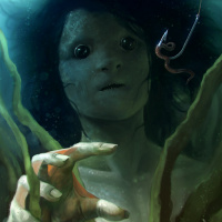 a fantastical scene of a mermaid. She is depicted with a human-like expression and upper body features, while her lower body appears to be that of a fish. She holds a fish in one hand and has seaweed or possibly hair around her neck. The background suggests