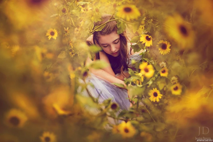 На картинке изображена молодая женщина с закрытыми глазами. Она оказывается в поле высоких подсолнухов, которые цветут вокруг нее. Ее волосы и одежда сливаются с естественными цветами сцены, придавая ей почти эфирное качество. Фокус на ее лице и цветах создает мечтательную или интроспективную атмосферу.