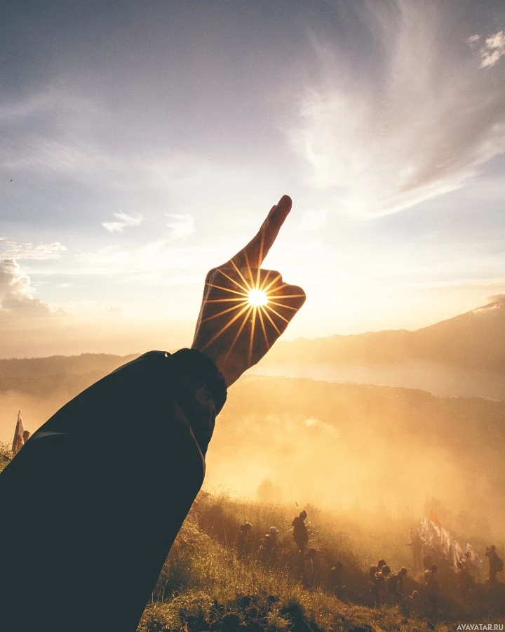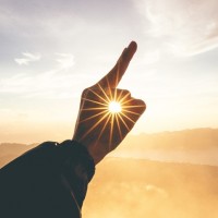 The image shows a hand pointing upwards towards the sun, which is setting or rising on the horizon. There appears to be an individual taking the photo from their own perspective, capturing this