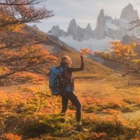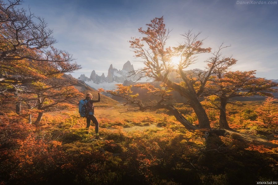 adventure scene with a backpack suggesting that the individual might be hiking or trekking in this picturesque area. The terrain looks rugged and wild, and there are