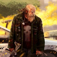 a scene of conflict or possibly aftermath of battle. The Punisher's attire includes