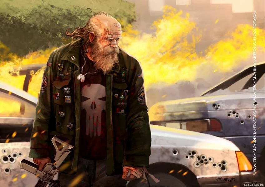 vigilante justice and often seen carrying firearms. In this particular image, he appears to be amidst some sort of