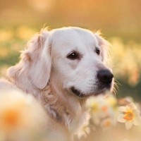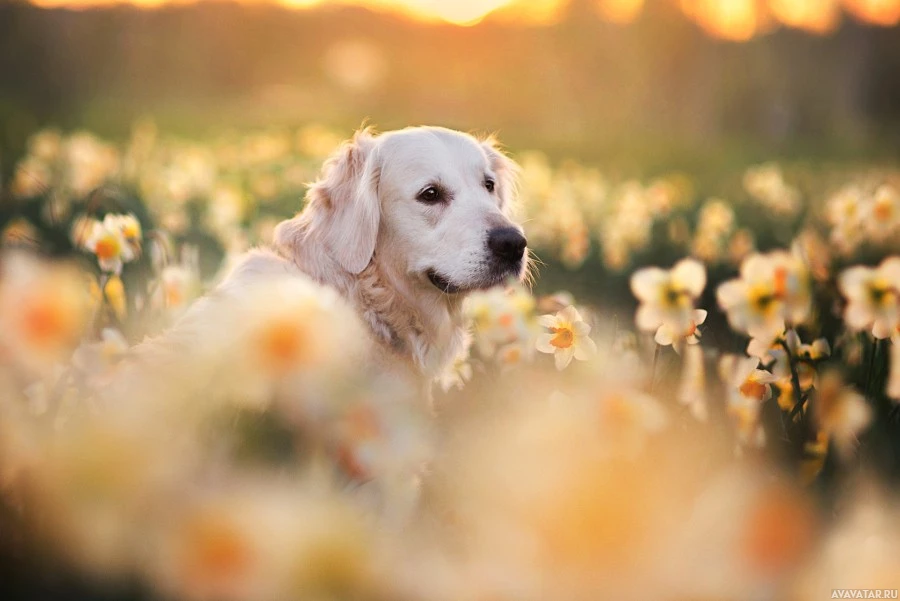 a Golden Retriever dog sitting among yellow flowers with long, golden petals. The setting appears to be a field or meadow during what looks like sunrise or sunset given