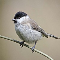 The image shows a small bird perched on what appears to be a reed. The bird has a light coloration with darker wingtips and tail, which could suggest it is a type of finch or warbler species.