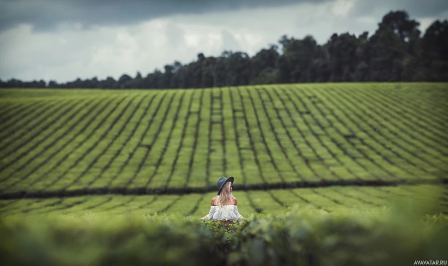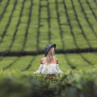 The image shows a person standing in what appears to be a tea plantation. The individual is wearing light-colored attire, including a blouse and skirt with lace or embroidery details, and a hat that matches the outfit. There are rows of tea plants on either side of the person, suggesting this could be a working tea farm. The background gives a sense of a rural landscape under what seems to be