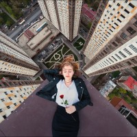 rise buildings. The focus of the photo appears to be on the individual and the flower they're holding, capturing a moment of tranquility amidst
