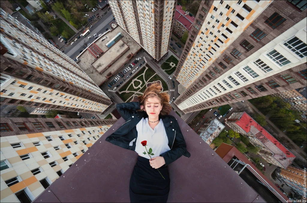 The image shows a person lying on their back on a rooftop, looking up at the sky. They are holding a rose in one hand. In the background, there is a cityscape with numerous high-