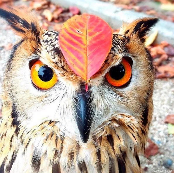 a red leaf perched on its head. The owl appears alert, possibly startled or surprised by something in the environment, as indicated by the wide-