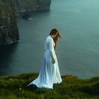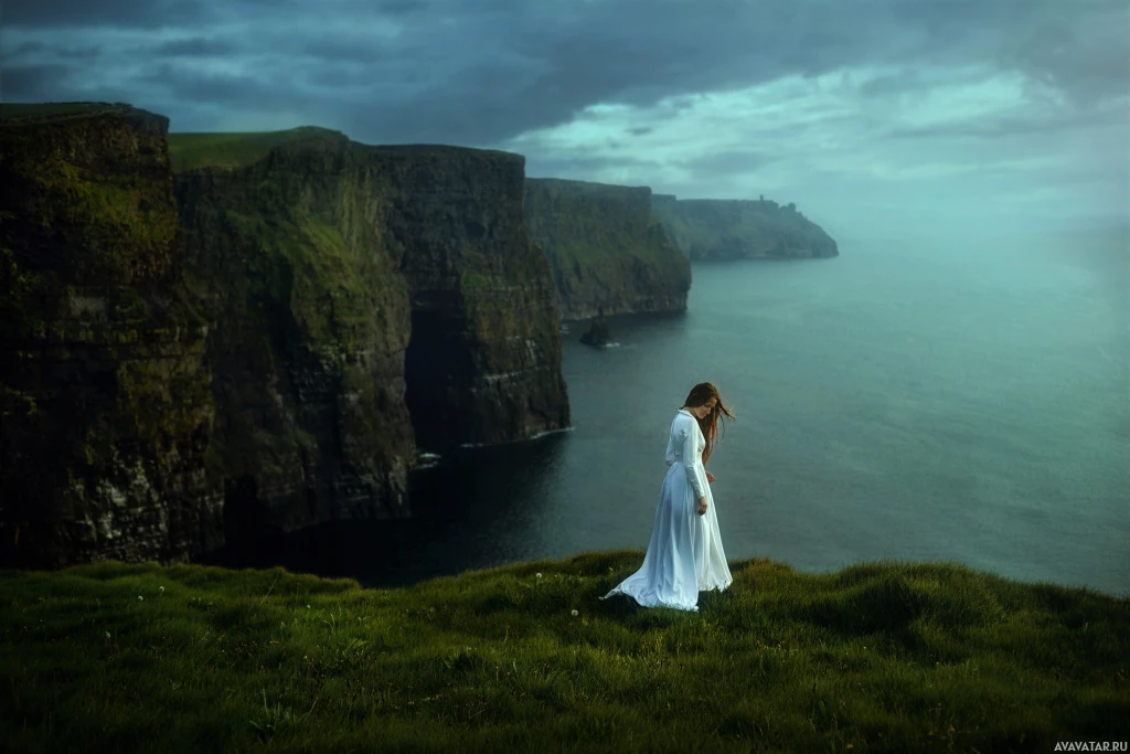 the edge of a cliff, looking out towards the sea. She is wearing a dress and her figure appears somewhat ethereal due to the way she blends into the landscape. The setting looks like it could be in a coastal region with high cliffs, possibly reminiscent of landscapes found in places known for their