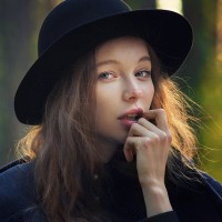 На картинке изображена молодая женщина в широкополой шляпе. У нее длинные прямые волосы, и она смотрит вдаль с вдумчивым выражением. Ее губы слегка расставлены, как будто она говорит или глубоко думает.
