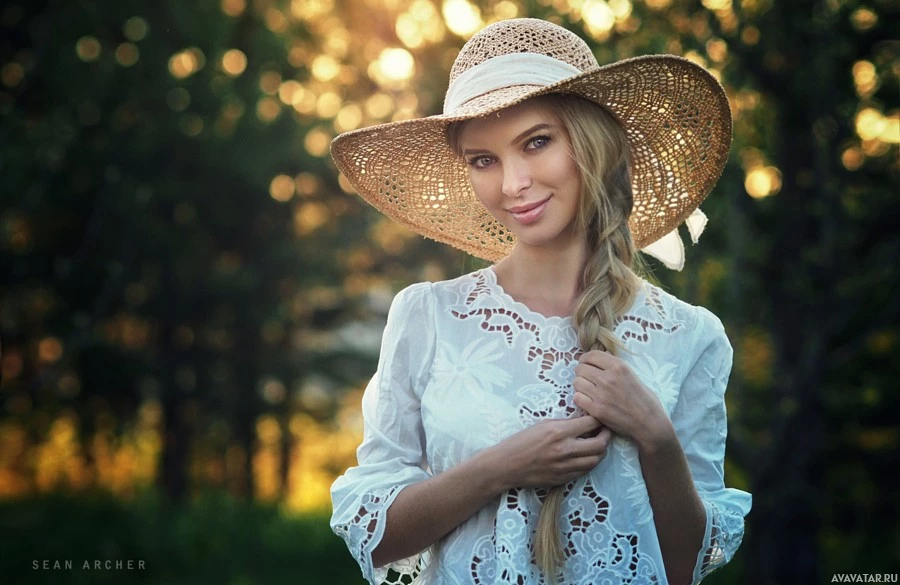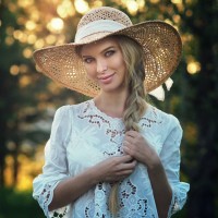 The image shows a woman posing for the camera. She is wearing a wide-brimmed hat, which could be described as straw or sun protection style, and she has long