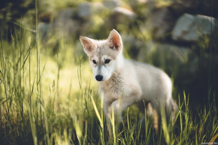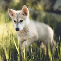 a young wolf in a natural, grassy environment. The wolf appears to be standing on all fours and is looking towards the camera with its ears perked up, which could indicate curiosity or alertness. The background suggests a field or meadow, possibly indicating that this photo was taken outdoors during daylight.