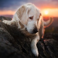 The picture features a golden retriever dog sitting on rocks. It appears to be either at sunrise or sunset, given the warm glow in the sky. The background has a scenic view of mountains and possibly some water below, adding to the serene atmosphere.
