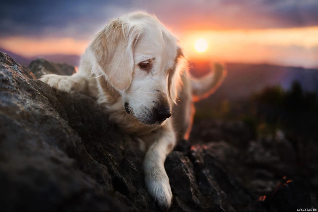 На картине изображена золотая собака-ретривер, сидящая на скалах. Он появляется либо на рассвете, либо на закате, учитывая теплое свечение в небе. На заднем плане есть живописный вид на горы и, возможно, немного воды внизу, что добавляет безмятежной атмосферы.
