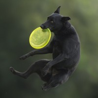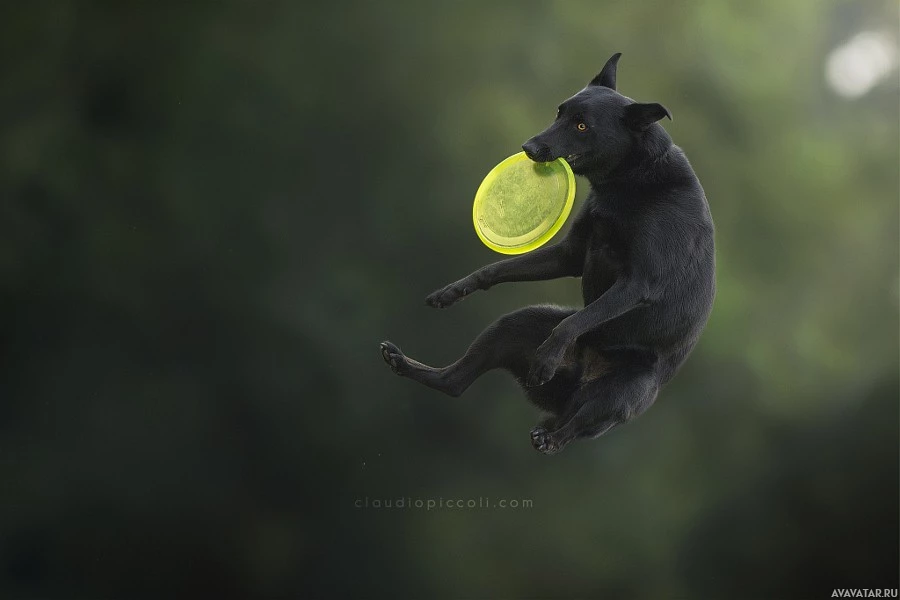 The image shows a dog in mid-air, seemingly leaping with