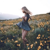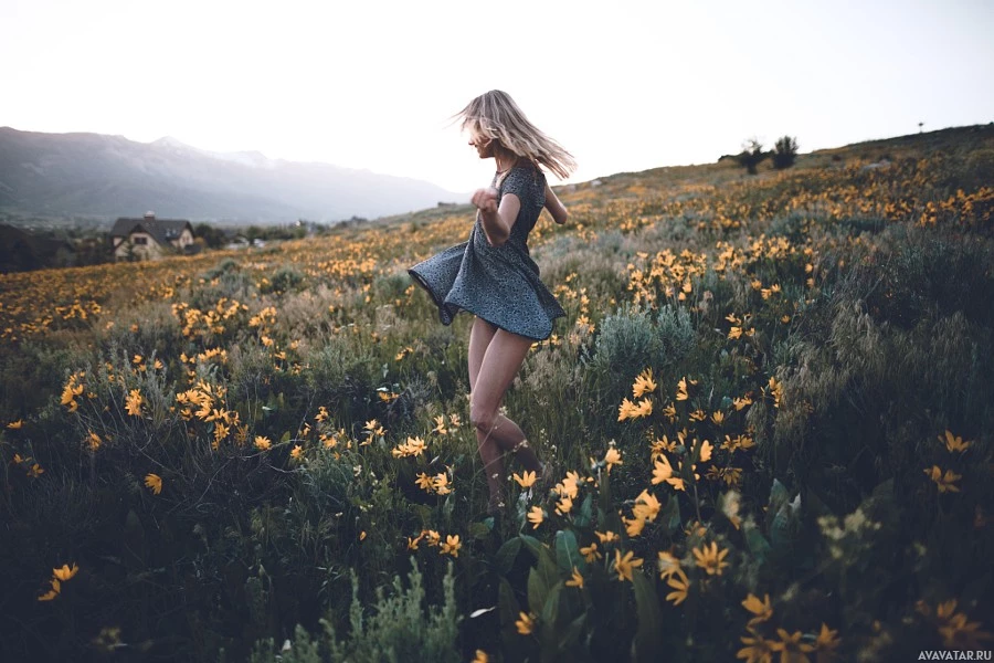 На снимке изображен человек, вероятно, молодая женщина со светлыми волосами, стоящая в поле высоких желтых цветов. Она наслаждается природой и одевается небрежно. Заходящее солнце дает сцене теплое свечение, предполагая, что это может быть ранний вечер или сумерки.