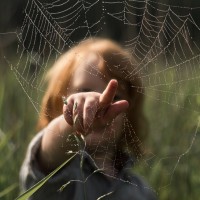 a natural setting with tall grasses or small plants in various shades of green, and there are spider webs visible between the vegetation. These webs are delicate and lacy, typical of those created by spiders for catching insects. The overall atmosphere is serene and somewhat mystical due to the blending of natural elements with