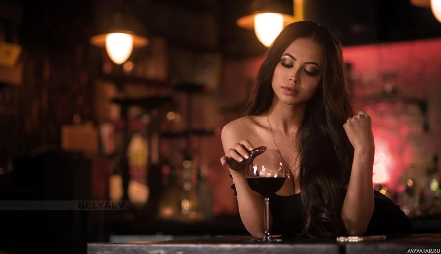 На картинке изображена женщина с длинными волосами, возможно, брюнетка, сидящая у барной стойки. Она держит бокал вина и, кажется, глубоко в раздумьях. Кажется, что она может быть персонажем из шоу или фильма в баре или аналогичном заведении.