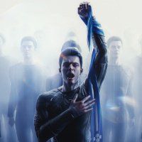 an open hand, suggesting a gesture of victory or celebration. He and the surrounding figures are wearing sleek, tight-fitting bodysuits that give off