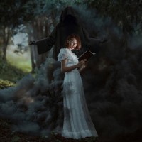 a forest with mist or smoke enveloping the scene, adding a mystical and eerie atmosphere to the image, which aligns with the fantasy genre description provided.