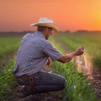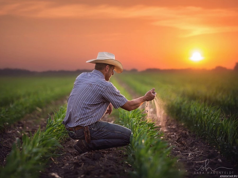 a cowboy hat and is kneeling on the ground next to a field that seems to contain young plants. The man has his hands held out as if he's either planting or checking on the growth of the crops. It captures a moment from behind, showing
