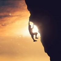 a silhouette of a person climbing a rock face at either dawn or dusk, as suggested by the warm tones in the sky. The scene is dramatic with fog and cloud formations adding depth to the composition. There are no other visible individuals or objects in the foreground, emphasizing
