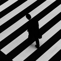 This is an image of a zebra crossing with alternating black and white stripes. There's a person walking across the zebra crossing, appearing as if they are about to step off the marked pedestrian area onto the road. The background is dark, suggesting it might be taken at night or in low light conditions.