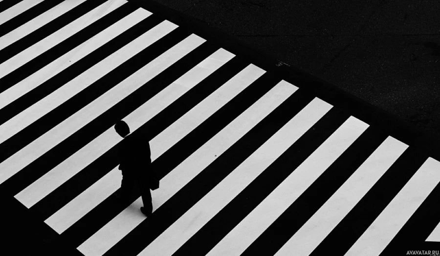 Это изображение скрещивания зебры с чередующимися черно-белыми полосами. Есть человек, идущий по переезду зебр, который выглядит так, как будто собирается сойти с обозначенной пешеходной зоны на дорогу. Фон темный, предполагая, что он может быть взят ночью или в условиях низкой освещенности.