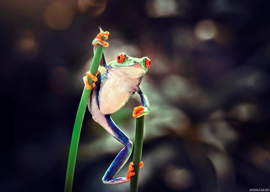 a blade of grass. The frog appears to be of the species that are known for their