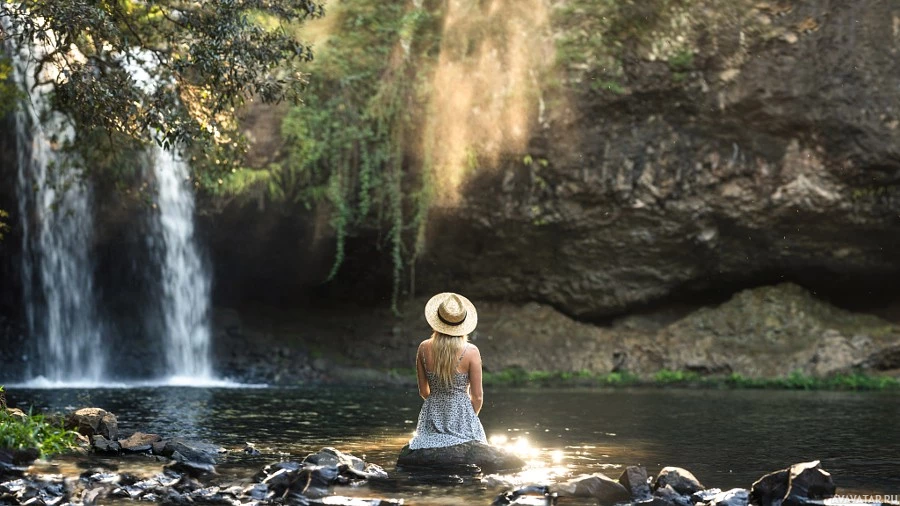 На картинке изображена женщина, сидящая у водопада. Она носит шляпу и, кажется, наслаждается природой, а солнечный свет проникает сквозь деревья на ее фигуру. На заднем плане каскад воды, предполагая, что это безмятежная и мирная обстановка.