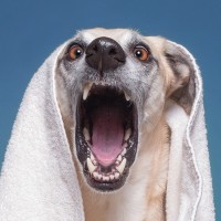 Картинка показывает собаку с открытым ртом, которая, кажется, зевает или лает. Собака имеет морщинистое лицо и сидит на синей поверхности. На теле собаки задрапированы белые полотенца, придающие ей юмористический и несколько растрепанный вид.