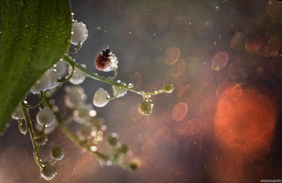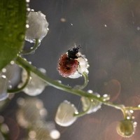dew droplets visible on its petals. In the foreground, there is an insect that appears to be a ladybug, and it seems to be resting or crawling along the stem or leaves of the plant. The background has a soft focus with warm tones and what looks like mist or light diffused in the air, creating