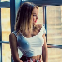an open window. She is wearing a white crop top and a plaid mini skirt, and appears to be looking out of the window with