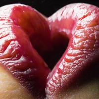 the shape of a heart, positioned as if they are kissing. The lips appear to be made up or painted in a darker shade, possibly for
