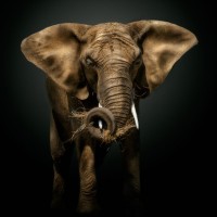 the natural behavior of elephants when they use their trunks for feeding or interacting with objects in their environment. The background is plain, suggesting that this might have been taken in a studio setting for a portrait or