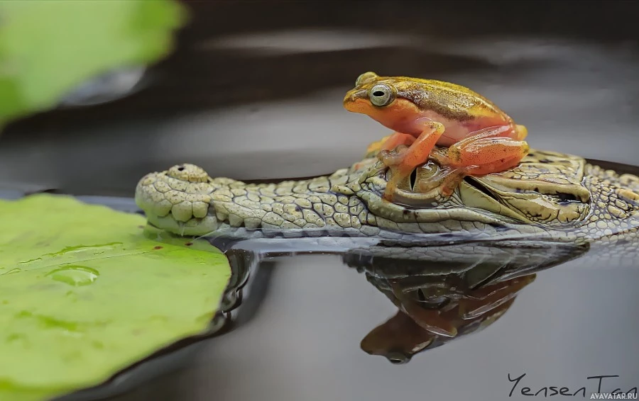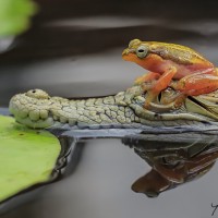 the back of a crocodile. The frog appears to be positioned between the crocodile's